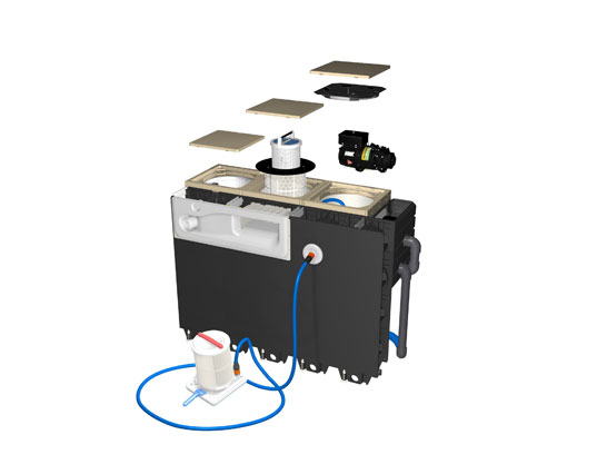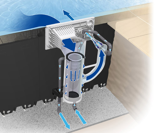 powierzchnia filtracji 7,2 m² , dokładność filtrowania do 15 mikronów (45 mikronów w filtracjach klasycznych typu filtry piaskowe) system filtracji wbudowany jest w szalunek ścianki basenu: nie ma konieczności budowy dodatkowego lokalu technicznego w ogrodzie pompa filtracyjna chłodzona wodą - odzyskane w ten sposób ciepło jest oddawane z powrotem do wody bez niepotrzebnych strat.
